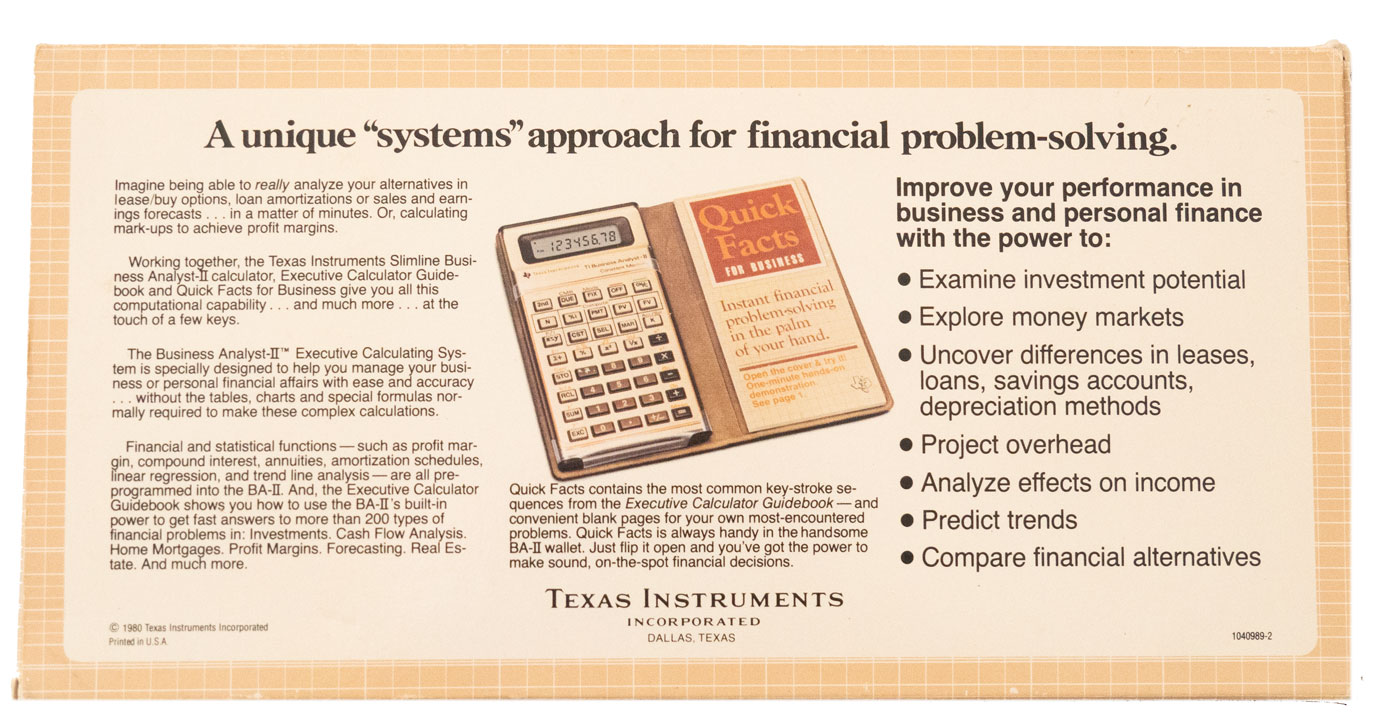 Hewlett Packard 15C (1982-1989) (Large Image) Advanced programmable scientific calculator using Reverse Polish Notation. It shares a similar design with the HP 12C financial calculator above. Both are part of the HP 10C series which included the HP 10C basic scientific calculator, HP 11C mid-range scientific calculator, HP 12C financial calculator, HP 15C advanced scientific calculator and the HP 16C computer programmer calculator. (HP 10C Series - Wikipedia.) The HP 15C was made from 1982 to 1989. It originally cost $135. That's about $315 in 2011 dollars - the price of a discount laptop computer. (For example, on the day I bought my HP 15C my local Radio Shack had a laptop computer on sale for $300.) While the HP 15C hasn't been made for over 20 years, it still has a following. Bring Back the HP 15C seeks to have HP resume production. 14,847 people in 175 countries have signed a petition stating they would buy 83,363 HP 15c calculators. (Curiously, that's an average of 5.6 calculators per person.) That site states the HP 15C is the best scientific calculator ever made by anyone for everyday use. Reasons: It uses Reverse Polish Notation (RPN) which is more efficient and natural, it was the smallest RPN calculator made by HP, the keyboard feel is very close to perfect, the landscape keyboard layout where you press keys with your two thumbs is better than a portrait layout where you press keys with one index finger, it has great battery life, the owner's manual is top notch, and it is the coolest looking calculator ever made! HP 10c Series - Wikipedia states it sells used for between $200 and $400. On the day I bought mine (July 23, 2011), one sold on eBay for $419! The range on eBay for about the past 15 days was from $92 to $600 with 25 of them sold. I bought mine at a garage sale in the San Carlos area of San Diego for $1.00! It is in good working and cosmetic condition. It was pretty dusty with some yellowing of the covering over the screen. It works fine, however. It did not come with the cover or manual. There are computer simulators at Hewlett Packard 15C - A Simulator for Windows, Linux and Mac OSX and at hp15c.com. As explained at hpmuseum.org the HP 15C supports a lot of advanced math including complex numbers, matrix math and many things beyond my comprehension! It uses three 1.5 volt LR44, S76 or similar button cell batteries which are readily available today. UPDATE: I was looking at amazon.com on 9-16-11 and noticed that HP now does sell a new edition of the HP 15c for $99. It's the same as the old one but up to 100X faster. Pretty cool - an electronic product being reintroduced after 22 years! The petition referred to above apparently worked! Congratulations. | ||||||||||||||||||||||||||||||||||||||||||||||||||||||||||||||||||||||||||||||||||||||||||||||||||||||||||||||||||||||||||||||||||||||||||||||||||||||||||||||||||||||||||||||||||||||||||||||||||||||||||||||||||||||||||||||||||||||||||||||||||||||||||||||||||||||||||||||||||||||||||||||||||||||||||||||||||||||||||||||||||||||||||